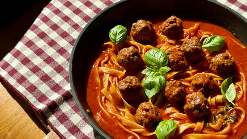 Smakrik comfort food på italienskt vis, det är vårt recept på frikadeller på Nöt & Grönt i tomatsås. Frikadellerna serveras med tagliatelle, parmesan och basilika. Perfekt som vardagsmiddag!