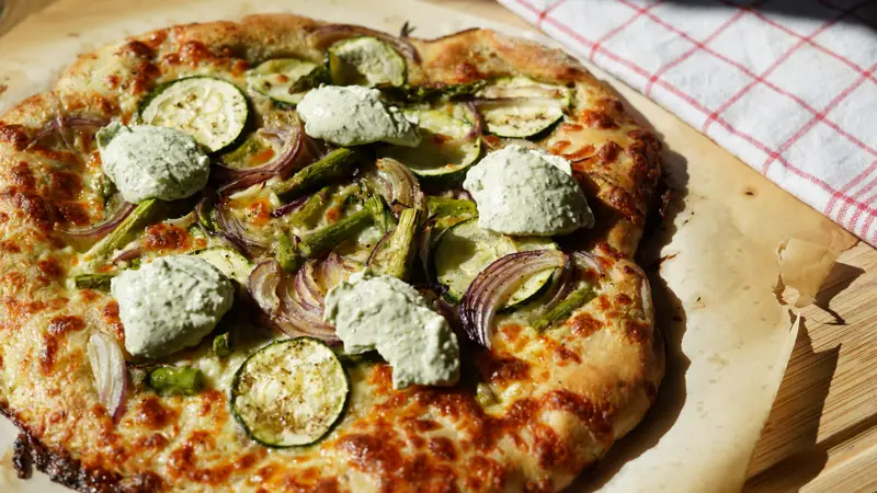 Vi firar in våren med en krispig pizza bianco, toppad med krämig crème fraîche, smält mozzarella och primörer som sparris, zuccini och vitlök. Avsluta med vår örtsås med vitlök och njut!