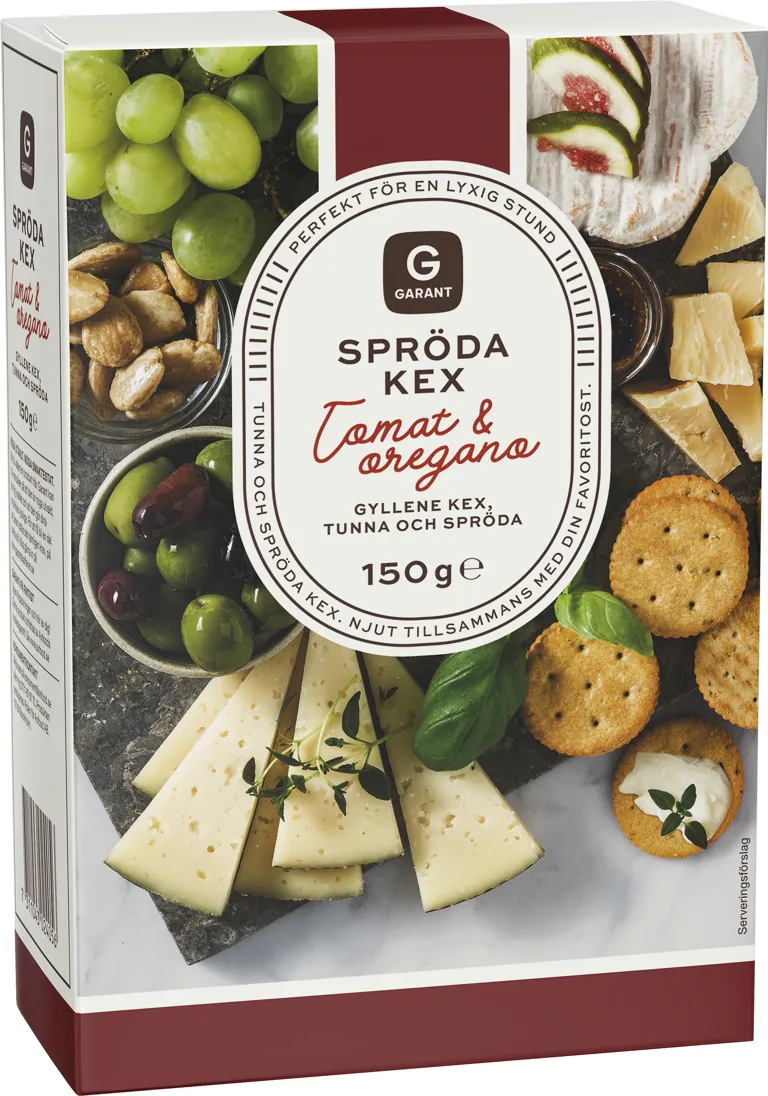 Tunna och spröda gyllene kex med smak av tomat och oregano. Ett enkelt och smakrikt tilltugg som passar lika bra till dina favoritostar som att njuta av direkt ur förpackningen. Ett lätt val som ger både vardag och helg lite mer smak. 150 gram.