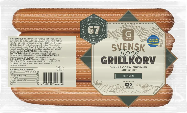 Svensk tjock grillkorv med 67% hög kötthalt med kött från Sverige. Lika god grillad som stekt. 320 gram.