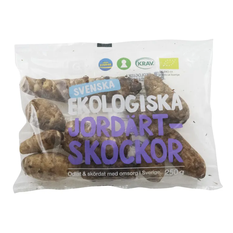 Ekologiskt odlad jordärtskocka, med vitt och saftigt kött, och en lite sötaktig smak och nötaktig ton. Jordärtskockor kan kokas och ätas som tillbehör till mat liknande potatis och passar mycket bra i bl.a. puré och soppor. 250 gram