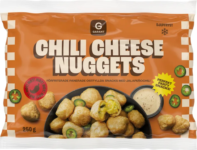 Djupfrysta chili cheesenuggets. Förfriterade och panerade ostfyllda snacks med jalapeñochili. Perfekt partysnacks! 250 gram.