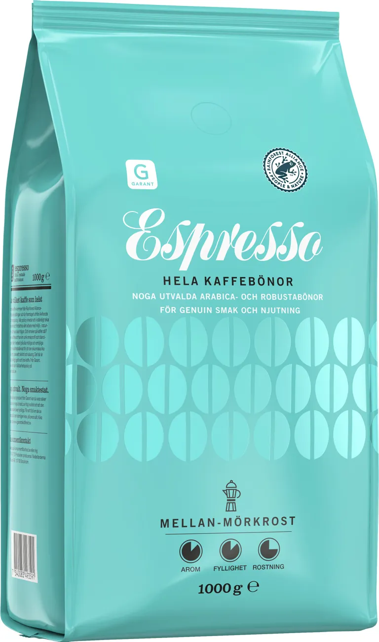 Hela kaffebönor Espresso med noga utvalda arabica- och robustabönor för genuin smak och njutning. Kaffebönorna har en unik smakprofil och blandningen är noga testad och kvalitetssäkrad för att den ska smaka lika bra året om, oavsett skörd och säsong. Garants kaffebönor kommer från Rainforest Alliance-certifierade odlingar som jobbar för att bevara ekosystem, vattenresurser, djurliv och rättigheter för arbetare samt deras familjer och samhällen.