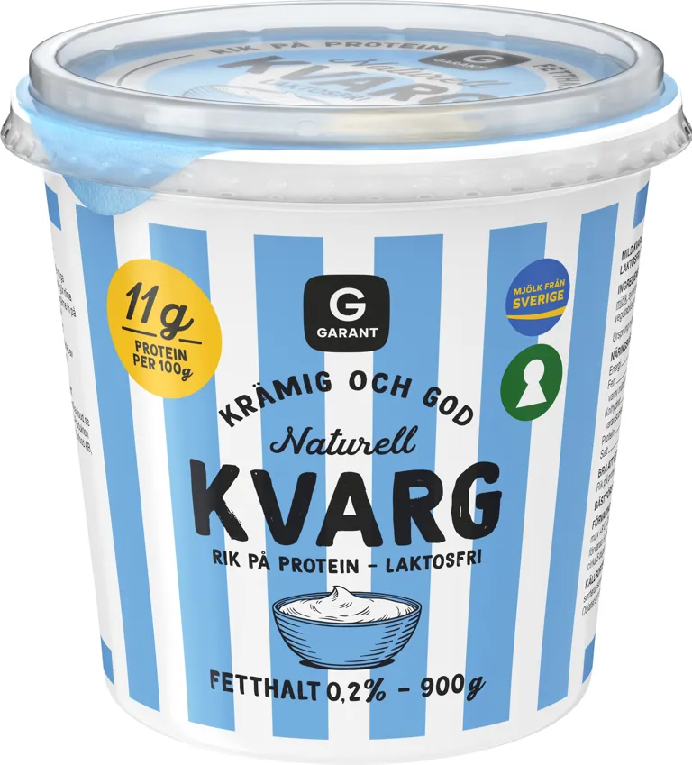 Krämig och god naturell kvarg med 11 g protein per 100 g, helt laktosfri. Passar perfekt i frukostskålen, i en smoothie eller som ett snabbt mellanmål. Ett enkelt sätt att fylla på med naturligt protein. Gjord på mjölk från Sverige. Fetthalt 0,2%. 900 gram.
