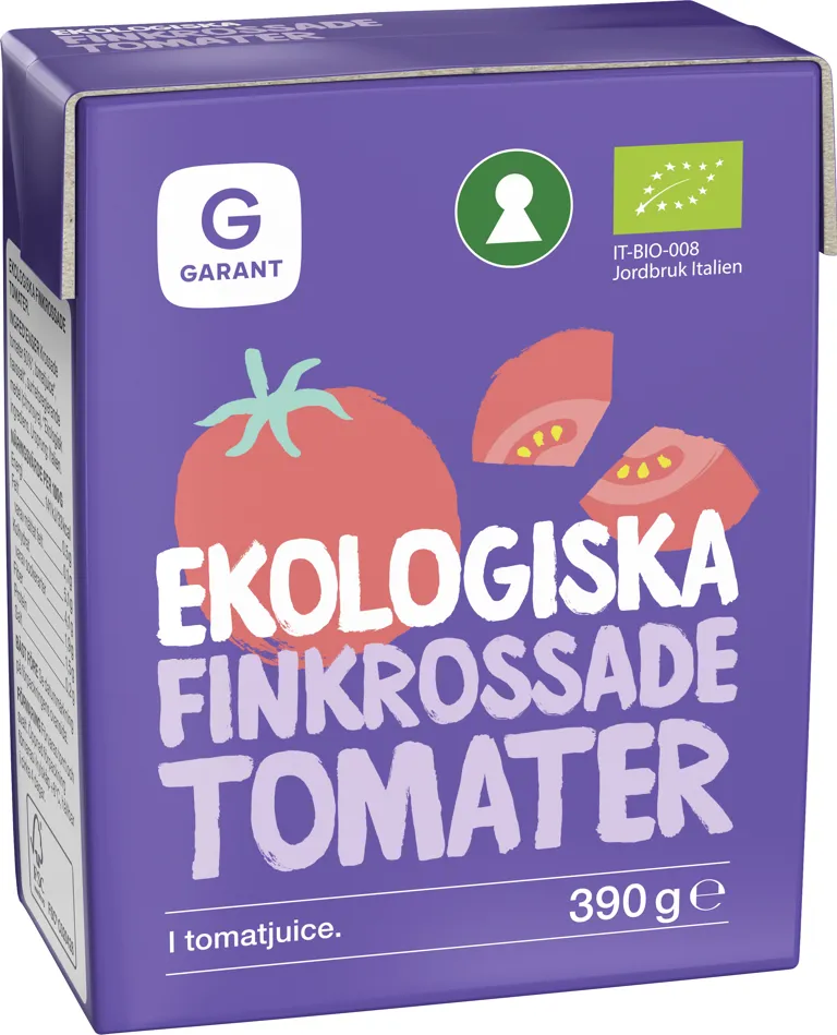 Ekologiska finkrossade tomater som tillverkats direkt från skörd av italienska tomater. Med sin fylliga smak passar den utmärkt till grytor, soppor eller andra varma maträtter. 390 gram.