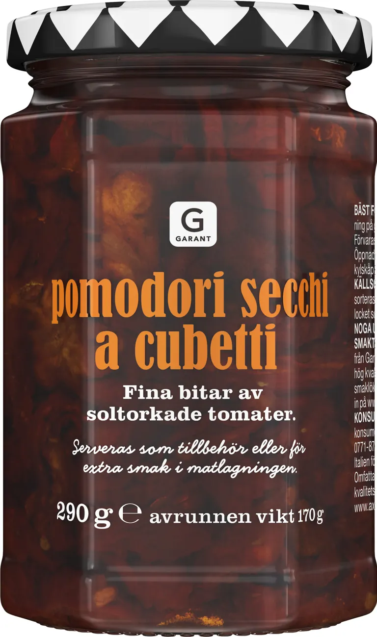 Fina bitar av soltorkade tomater. Serveras som tillbehör eller för extra smak i matlagningen. 290 gram, avrunnen vikt 170 gram.