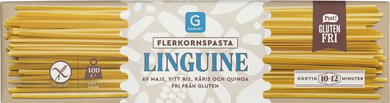 Glutenfri flerkornslinguine från Garant. Tillverkad av majs, vitt ris, råris och quinoa. Kokas i 10-12 minuter. Vår flerkornslinguine är märkt med det Överkorsade axet från Svenska celiakiförbundet. Hittar du den på en produkt vet du med säkerhet att produkten är glutenfri.