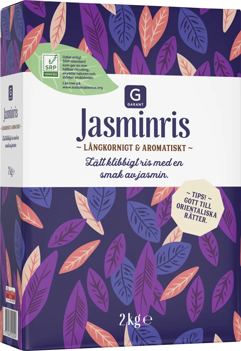 Långkornigt och aromatiskt jasminris 2 kg. Jasminris är ett vitt och långkornigt ris med en doft och smak av jasmin. Riset har en lätt klibbig konsistens och passar utmärkt till asiatiska rätter. Jasminris är det traditionella tillbehöret till thailändska rätter, men förekommer också som ett baslivsmedel i hela Sydostasien.
