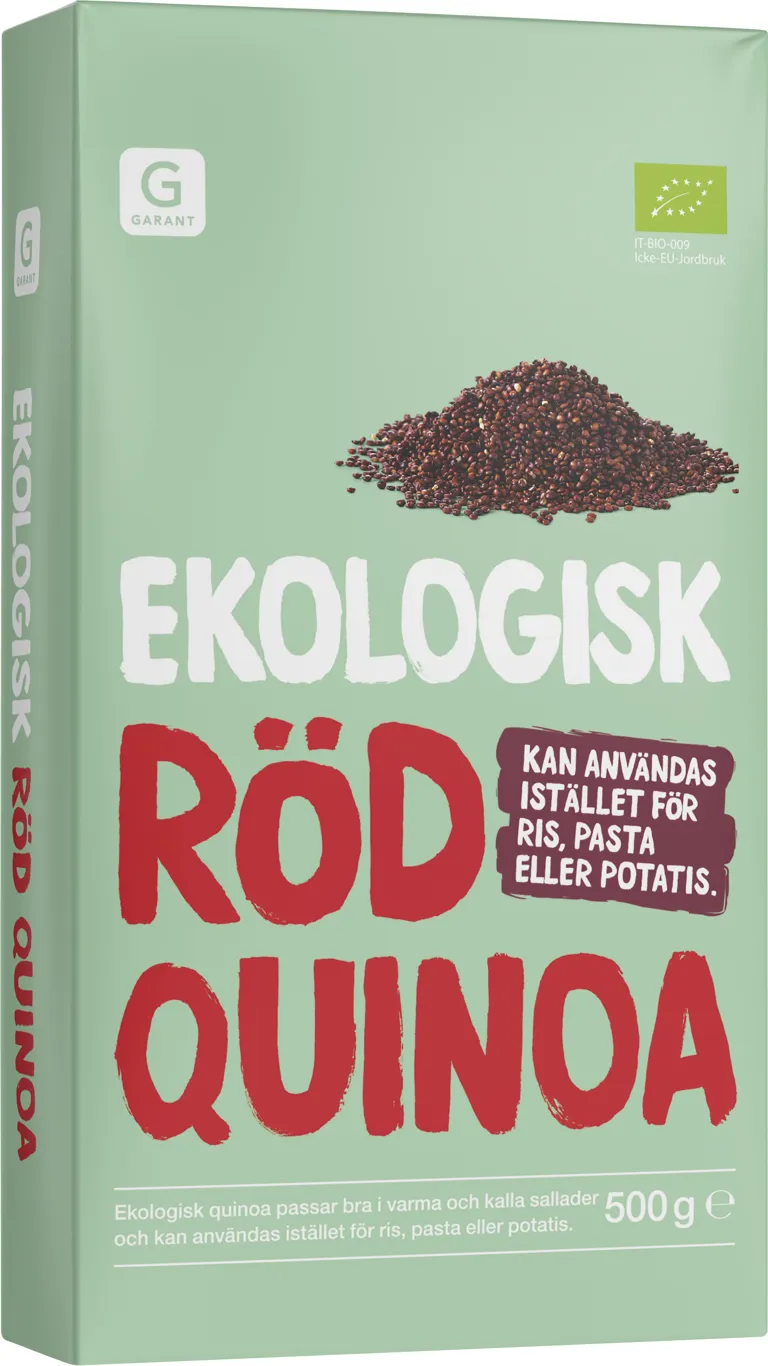 Ekologisk röd quinoa. Gott i kalla och varma sallader och istället för ris, pasta eller potatis. 500 gram.