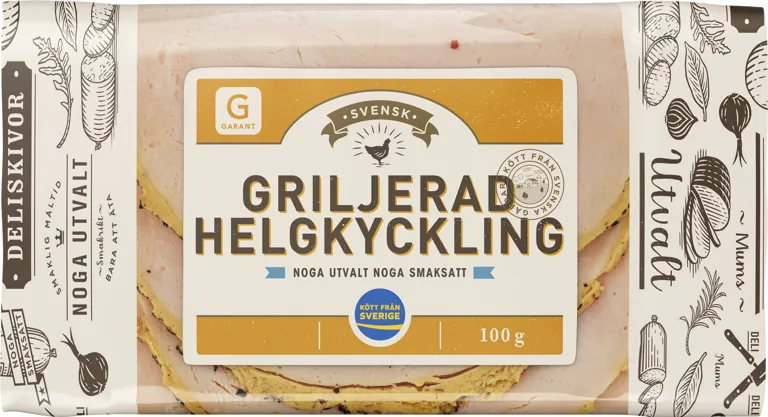 Griljerad kyckling i skivor. Fågel från svenska gårdar. 100 gram.
