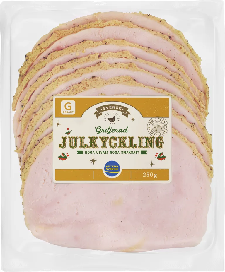 Griljerad julkyckling i skivor. Fågel från svenska gårdar. Noga utvalt och smaksatt. 250 gram.
