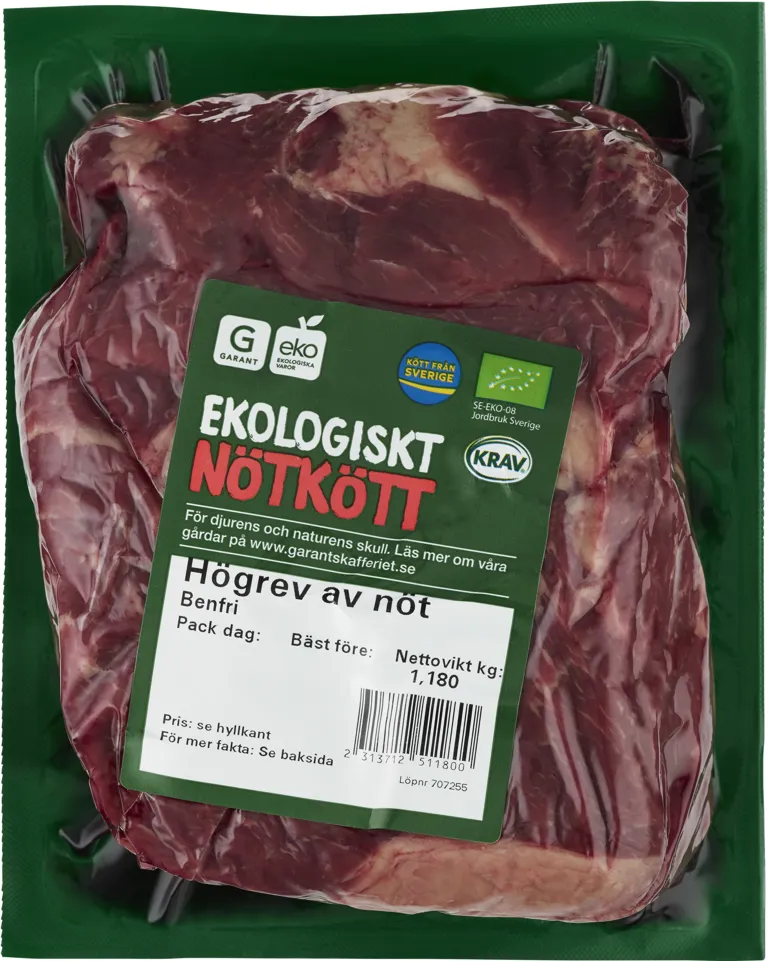 Vår ekologiska och kravmärkta högrev kommer från svenska gårdar där djuren får leva med utomhusbete och möjlighet att uttrycka sina naturliga beteenden. Djuren har möjlighet att beta, böka och bada gyttjebad. Det gör också att de växer lite långsammare och smakerna i köttet hinner mogna på ett bra sätt. Djuren har också fri tillgång till bra grovfoder som är ekologiskt odlat eller KRAV-certifierat, ofta odlat på den egna gården. Det innebär odling utan bekämpningsmedel och handelsgödsel. Genom att köpa Garant ekologiska kött värnar du om en extra god djuromsorg och vår miljö!