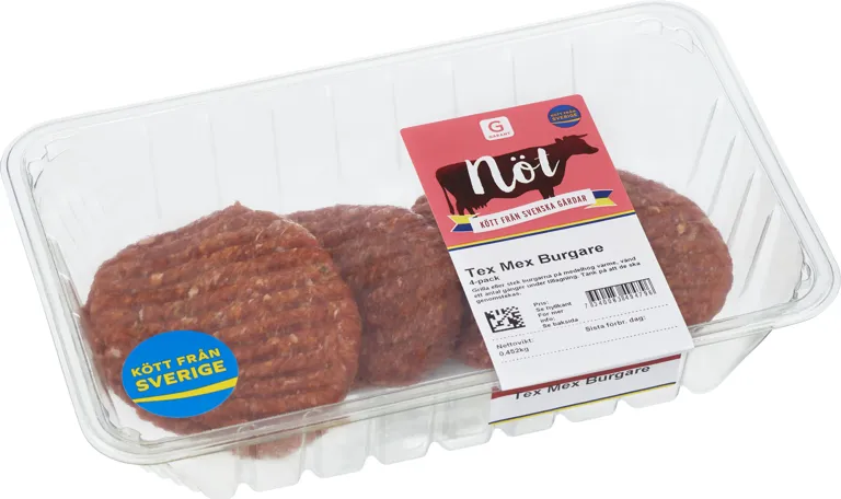 Färska hamburgare med texmex kryddning. Kött från svenska gårdar. 4-pack.